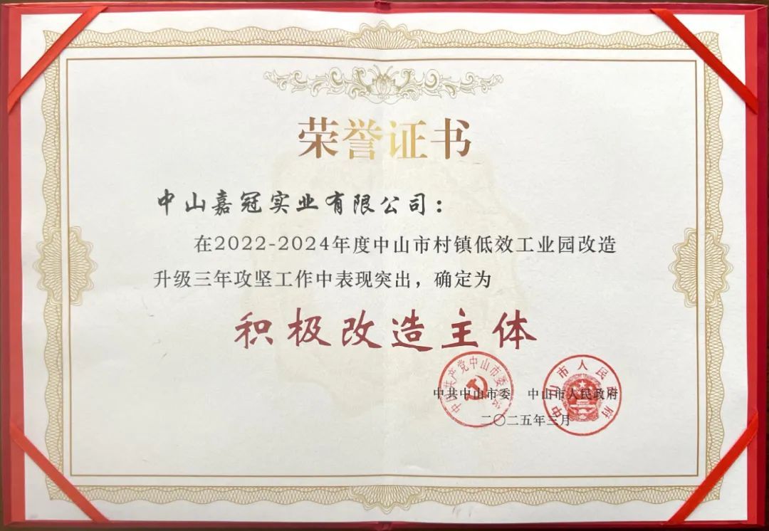 3月21日,中山市村镇低效工业园改造升级推进会召开,总结三年“工改”攻坚情况,镇街、村(社区)、企业代表作交流发言,并表扬 2022-2024年度中山市村镇低效工业园改造升级工作表现突出的集体和个人,而我司更被评为"2022-2024年度中山市村镇低效工业园改造升级 积极改造主体”。此次荣获 “积极改造主体” 称号,是对其在 “工改” 工作中突出贡献的高度认可。这一成就的背后,离不开镇、市各级领导的高瞻远瞩与大力支持。