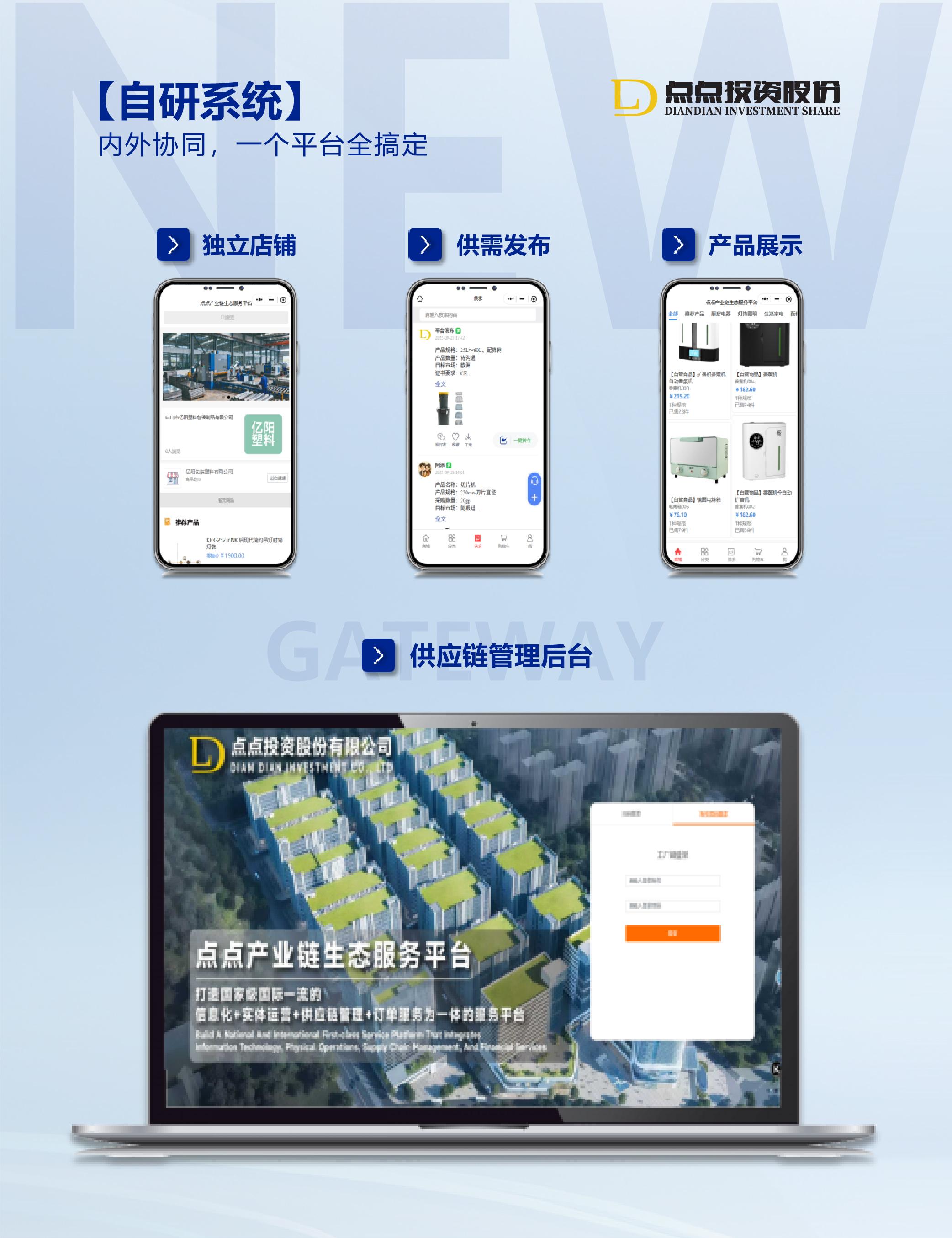 点点产业链生态服务平台是一个以区域产业集群为依托,产业园区为核心,服务于入园和拟入园企业及其上下游全方位、一站式的综合性运营平台。平台通过整合线上线下资源,为核心企业及其上下游企业提供便捷、高效、专业的供应链服务,助力用户企业快速发展,推动产业升级,形成产、供、销一体化的产业链生态闭环。平台将努力成为国内领先的产企融合、产业共享、政企互联的专业区域生态运营服务商,赋能产业园区和区域经济,让产业升级创新焕发“点点”力量。